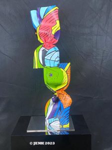 En l'honneur du cinquantenaire de la disparition de Pablo Picasso, Barbizon invite une cinquantaine d'artistes contemporains à exposer. Depuis le 08 04 et jusqu'au 10 06 2023, JENK expose son oeuvre en hommage aux 50 ans de la disparition de Picasso. C'est un Wrapping Bonbon Hommage à Picasso qui mesure 98 cm sur socle aluminium et il est en polyester. Jusqu’en juillet, à Cambrai, JENK expose aussi d'autres réalisations de grande taille. Deux de ses oeuvres sont présentes à Dubaï jusqu’à la fin septembre 2023.Elle participe au Concours d’élégance Auto Moto organisé à l'initiative de Cavigal Auto Moto sur le port de Nice. Pour cette occasion, JENK expose sur le podium une sculpture Wrapping Bonbon Rouge de 120 cm. Le trophée qui va récompenser la catégorie Dolce Vita est la sculpture Monacandy de couleur turquoise et 40 cm de hauteur. Cette oeuvre de l'artiste JENK est unique.